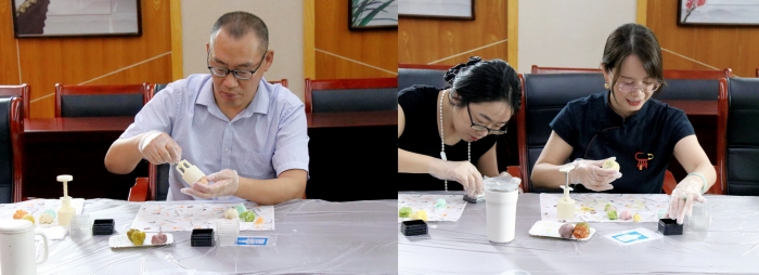 活动伊始,分工会主席向全体教职工致以节日的问候,并阐述了中秋佳节的文化内涵与团圆寓意。专业面点师现场演示了冰皮月饼的制作工艺,从馅料包裹到模具使用,每个环节都作了细致讲解。老师们兴致盎然地投入实践,包馅、压模,动作由生疏到熟练,现场气氛温馨而热烈。在一片欢声笑语中,一个个晶莹剔透、印有精美花纹的冰皮月饼逐渐成型,空气中弥漫着淡淡的甜香。