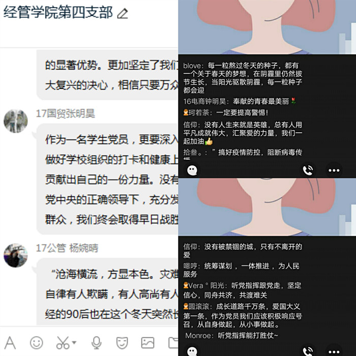 参会党员通过弹幕以及群内发言的形式积极踊跃的交流自己的想法与收获,郑重表示要像身边的优秀党员学习,进一步提高思想认识,服从大局、遵守疫情防控各项规定,自觉维护社会秩序。