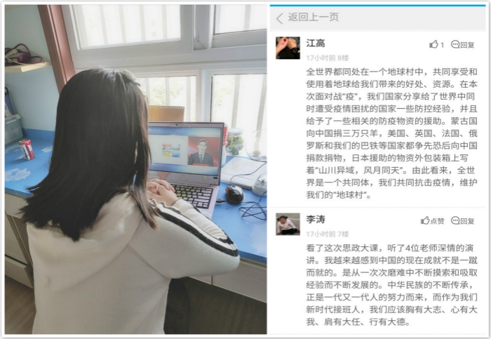 直播结束后,各班辅导员积极组织召开“疫情防控思政大课”学习交流主题班会。同学们纷纷表示,在举国上下万众一心、众志成城做好新冠肺炎疫情防控工作的特殊时刻,疫情防控“思政大课”就像是一场对老员工思想政治教育的“及时雨”,对员工来说是一场思想的大洗礼,更是一次很宝贵的提升;同学们谈到,疫情胜利来之不易,平安健康就是幸福,社会主义制度优越,党的领导、人民军队好,中国综合实力及理论道路的正确性得到展示,我们对疫情战胜充满必胜信心,坚信在中国共产党的正确领导下,中国人民万众一心,众志成城,一定可以战胜病魔。作为青年老员工,我们一定努力学好本领,不忘初心,不负韶华,为未来国家建设打下坚实的知识基础。