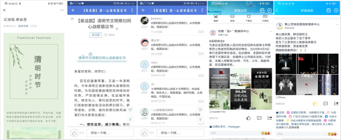 清明节当天,该院微信公众号“逐梦经管”、易班微社区向全院员工发布“云清明,寄哀思”和《清明节文明祭扫,同心战疫倡议书》号召全体团员青年充分发挥示范带头作用,提倡采取网络祭扫、代理祭扫、小规模家庭追思等方式,做文明祭扫的践行者,团员青年纷纷在易班微社区上留言:文明祭扫,从你我做起,祖国加油!。各班级也相继开展默哀致敬、主题征文等主题团日活动。