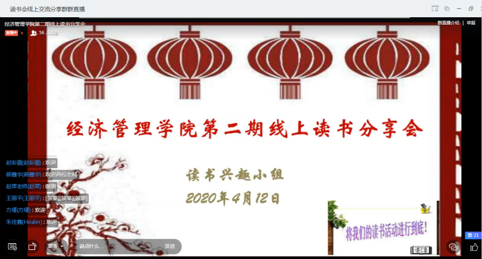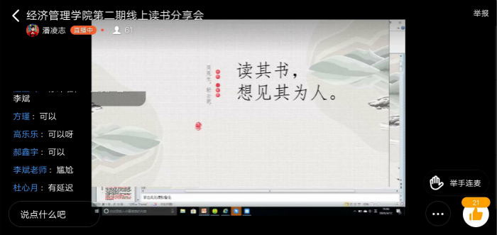 主讲人通过优雅深邃的语言,绘声绘色地向同学们分享读书心得。杜心月同学在讲述《屈原列传》文本时,本着“读其书,想见其为人”的知人论世理念,着力理解人物在历史进程中的优秀品格和高尚灵魂;方瑾同学分享的《项脊轩志》,从作者简介和创作背景两方面,反映了归有光挚爱亲情和复兴家族的责任感,深刻分析了他的创作源泉,为听客理解文章提供支持。同学们根据自己的理解,以申请连麦的方式对主讲嘉宾的内容发表了自己独到的观点。两位老师分别作内容点评。李斌充分肯定了参会员工的文化素养和学习自觉性,充分认可读书分享会的意义;赵翠认为“凡有所学,皆成性格”,具体分析各主讲人的主讲内容,鼓励同学们坚持读书,提升修养,并逐步培养自身人文情怀。最后,本次活动指导老师汪玉玲作总结。