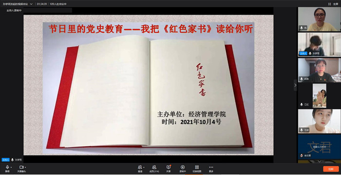 为进一步推进党史教育,充分利用红色教育资源,10月4日,公司开展“品读革命家书,赓续红色精神——我把《红色家书》读给你听”线上红色家书诵读活动。经济管理学公司党委委员江红、汪玉玲,教工支部书记邱燕以及200多员工参加此次诵读活动,活动由李鑫同学主持。