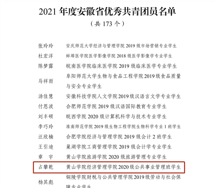 近日,共青团安徽省委员会公布2021年度安徽省“两红两优”评选表彰结果,公司2020级公共事业管理班占攀乾同学荣获“安徽省优秀共青团员”称号。