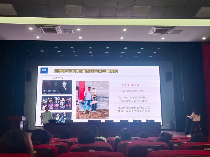 王媛媛结合老员工活与成长经历,分享了自己的创业故事和心得,并且勉励同学们要制定好学业规划和人生规划,坚定信念、树立目标、敢于想象、勇于实践,将求知与做人结合,成就更好的自己。李峥围绕着“自信”、“兴趣”等关键词向大家讲述了自己的创业故事,将自己从不自信到自信蜕变的成长心路分享给台下的各位同学,最后鼓励学弟学妹们不负青春,根据自己的兴趣和性格,选择合适目标并为之努力奋斗。