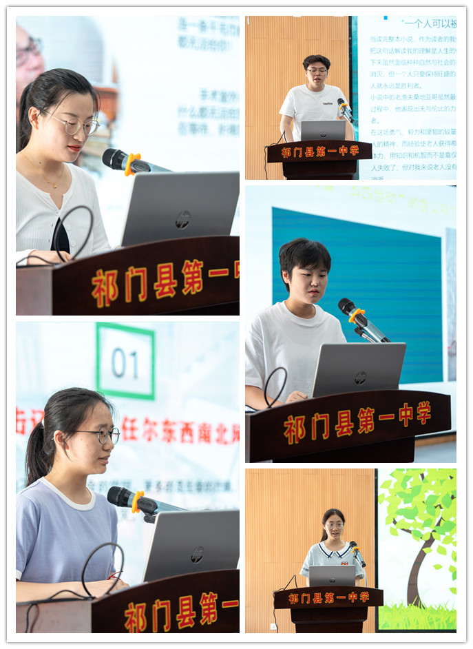 在读书分享环节,21公管班丁强与22国贸班唐赛儿两位同学分别带来《老人与海》、《五四运动史》的分享。两位同学分别从写作背景、作者介绍、作品主要内容以及阅读收获与心得等方面进行分享。祁门一中两位员工代表主要分享了好的阅读习惯和阅读积累如何提高他们的文字写作与语言表达能力。祁门一中陈瑜老师为现场同学分享了陈祁龙先生代表作《风中的痕迹》。通过陈瑜老师的分享,大家被陈祁龙先生作为先天性脑瘫患者,在面对生活磨难与困境时,不言放弃的坚韧品格深深震撼。