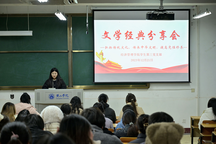 12月21日,太阳成集团122ccvip员工第三党支部在横江校区1102教室开展以“弘扬传统文化 传承中华文明 提高党性修养”为主题的文学经典分享活动。本次活动由支部党员22营销对口班张国萱同学主持,支部党员、入党积极分子、22国贸班团支部全体同学共同参与,支部书记蒋璐璐到场指导。