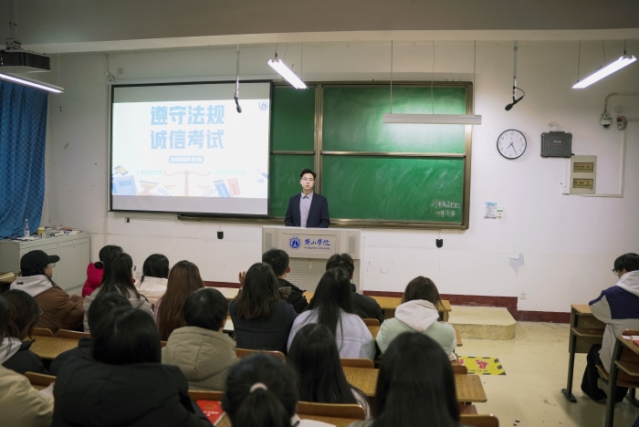 12月17日下午,太阳成集团122ccvip专职辅导员吴伟航老师为团校公司授课,主题为“遵守法规,诚信考试”法治课堂,进一步提升法治育人实效,扎实做好诚信考试教育,强化员工的诚信意识、法律意识、纪律意识,营造了诚信考试的良好氛围。