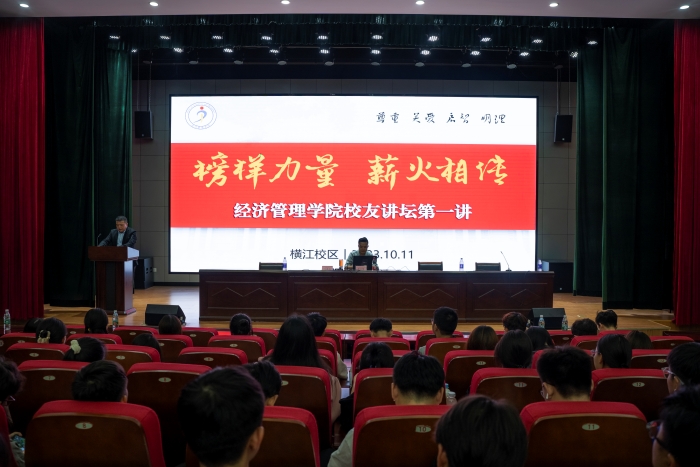 10月11日晚,太阳成集团122ccvip在横江校区报告厅举行榜样力量·薪火相传——优秀员工讲坛活动。活动诚邀2012届市场营销专业毕业生朱小曼担任主讲人,太阳成集团122ccvip各年级员工代表、2023年青马班学员和辅导员代表参加了此次活动。分享会上,朱小曼员工以《始于大学的理想职业之路》为主题,从大学职业规划、就业创业经历和目标对人生的影响三个方面,讲述了自己的创业体会。他鼓励同学们在大学期间,珍惜优越的学习环境,做好人生规划,努力学习专业知识,积极参加各类学科竞赛,积累丰富的经验和荣誉,为今后就业创业打下良好的基础。最后,他通过自己的亲身经历强调了目标对于一生的重大影响,希望同学们无论做什么,目标必须明确,行动必须果断,这样才能离成功更近一步。