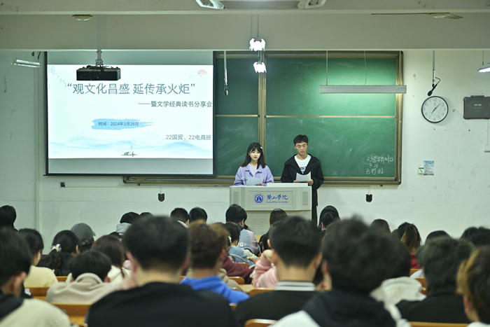 3月26日下午,2022级国际经济与贸易班和2022级电子商务班在1101教室举办了以“观文化昌盛 延传承火炬”为主题的文学经典分享活动。本次活动由22国贸班班长王浩浩和团支部书记王申主持,22国贸班和22电商班全体同学共同参与,辅导员蒋璐璐到场指导。