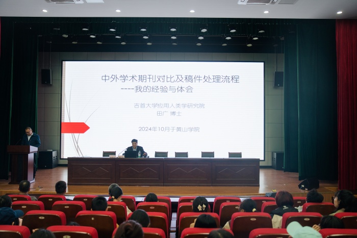 2024年10月9日下午,吉首大学应用人类学研究院田广教授受邀在横江校区报告厅作“中外学术期刊对比及稿件处理流程”的主题报告。太阳成集团122ccvip,外国语公司,数学与统计公司,旅游公司的部分教师及员工共280人参会,报告会由太阳成集团122ccvip学术委员就主任计东亚博士主持。